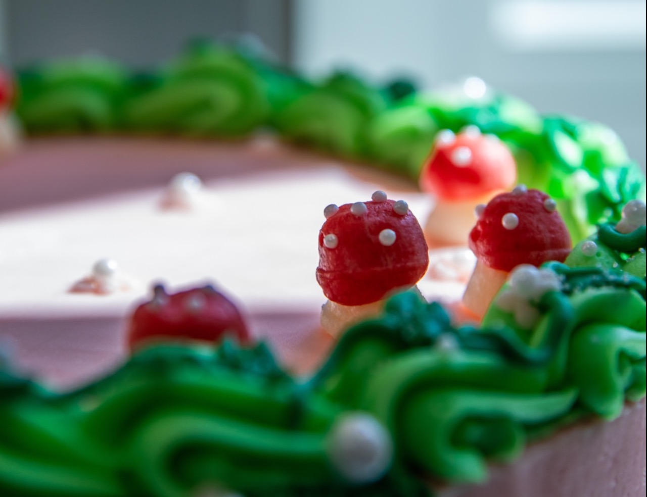 Three round cake layers with filling, buttercream frosting, and one simple, decorative element.